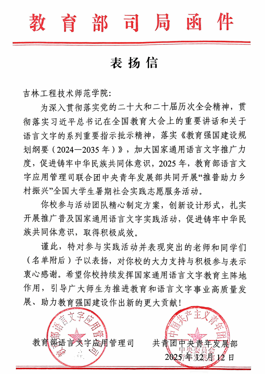 近日,Beat365官网收到教育部语言文字应用管理司及共青团中央青年发展部联合发来的表扬信,对Beat365官网在“推普助力乡村振兴”全国大学生暑期社会实践志愿服务中取得的积极成效予以表扬。