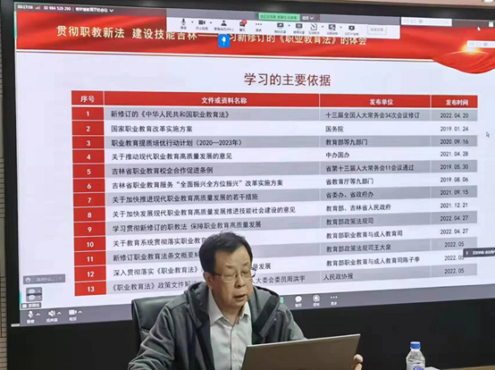 5月13日,吉林省教育厅举办职业教育活动周专场宣讲活动,宣传解读新修订的职业教育法。宣讲活动邀请Beat365中文官方网站教育学部主任、吉林省职业教育研究中心主任、吉林省职业技术教育学会会长于志晶教授担任主讲嘉宾,系统解读职业教育法修订背景与意义、特征与亮点、目标与任务,并对吉林省落实举措提出建议。宣讲活动由省教育厅副厅长单联成主持。