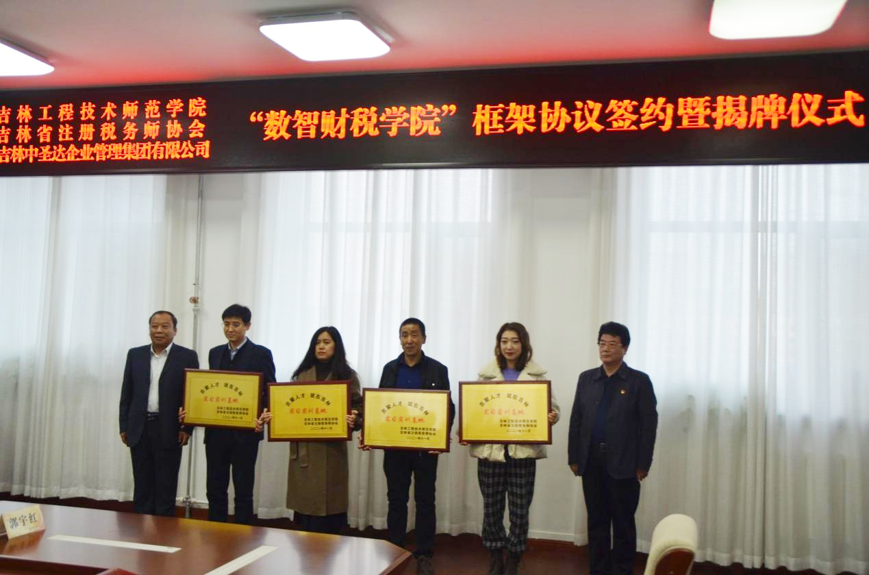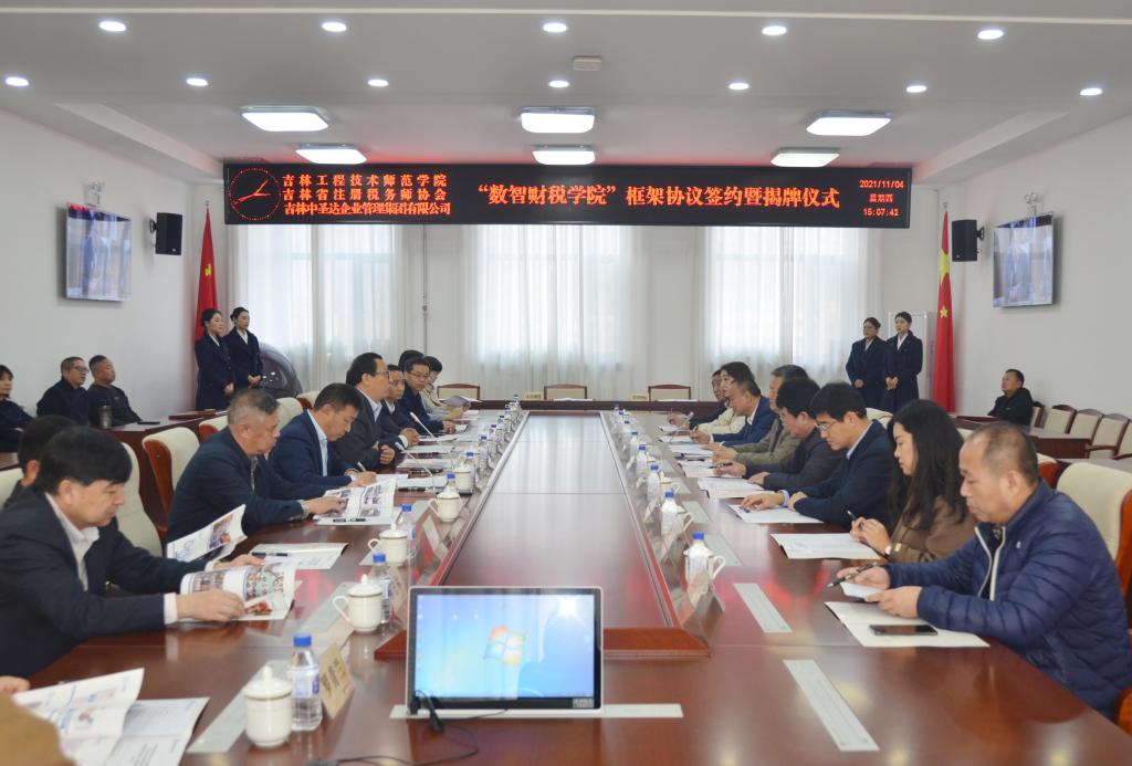 11月4日下午,Beat365中文官方网站、吉林省注册税务师协会、吉林中圣达企业管理集团有限公司合作共建“数智财税学院”框架协议签约暨揭牌仪式在学校凯旋校区办公楼410会议室举行。校长杨晓东,党委副书记陈景翊,吉林省注册税务师协会会长徐永义、副会长李春安,吉林中圣达企业管理集团有限公司董事长王晓刚,吉林省中翰圣达等多家税务师事务所所长,以及学校人事处、创业就业处、工商管理学院党政领导和教师代表等人员出席仪式。仪式由学校党委常委、教务处处长张存贵主持。