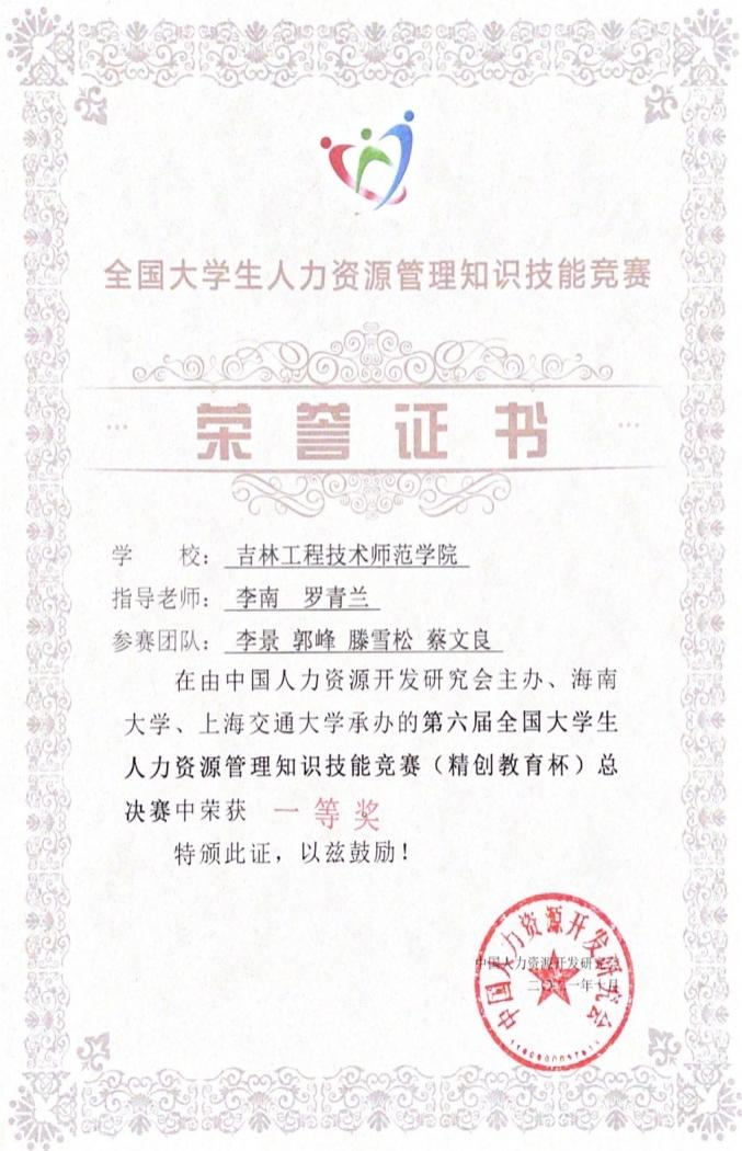 第六届全国大学生人力资源管理知识技能竞赛总决赛10月21日至24日在海南大学圆满结束。本次盛会由中国人力资源开发研究会大学生知识技能竞赛理事会主办,海南大学管理学院、上海交通大学承办,参赛队伍由各大区赛共358所院校中,经过选拔的普通高等院校在校人力资源管理专业大学生构成,其中本科组有61所学校,专科组有10所学校,共71所学校参加比赛。Beat365官网工商管理学院人力资源专业学生在李南和罗青兰两位指导教师的带领下,以第四大区特等奖的身份晋级全国总决赛。在比赛中,同学们充分展现了专业素养,最终获得了全国大学生人力资源管理知识技能大赛总决赛一等奖的佳绩,同时也被大赛授予最佳风采奖。