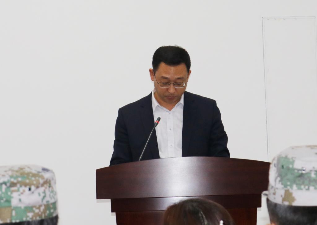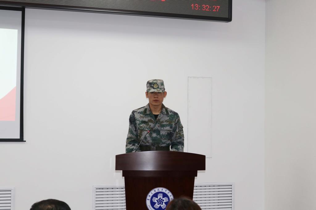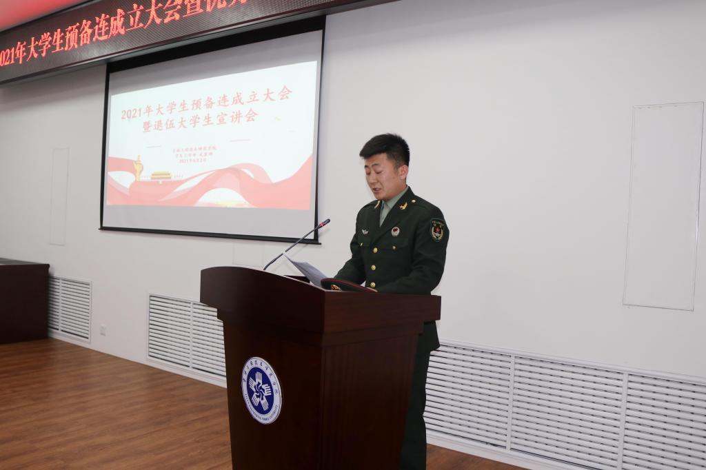 会上2021年大学生预备连连长信息工程学院郭江山同学发言。他代表预备连对学校为广大热爱国防与军队建设的同学们提供这次难得的锻炼机会表示感谢。同时,对预备连全体成员提出倡议,一是做好学生思想发动工作,切实发挥预备连建设实效;二是搞好连队建设,统筹完成好各项训练任务;三是发挥征兵宣传员作用,营造浓厚的国防氛围。