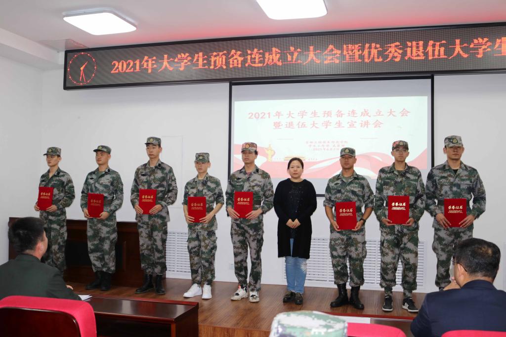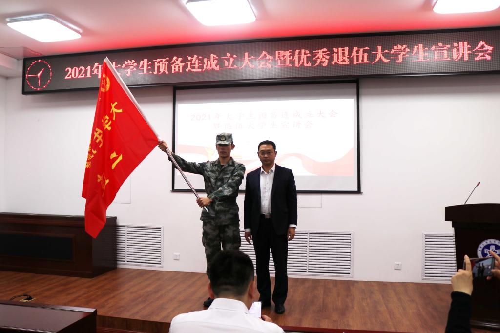 会议在庄严的国歌声中开始。首先,学工部学生管理科科长董浩然宣读了《2021年大学生预备连成员名单》;王宝龙部长向预备连授旗;刘晓敏为预备连学生代表颁发证书。