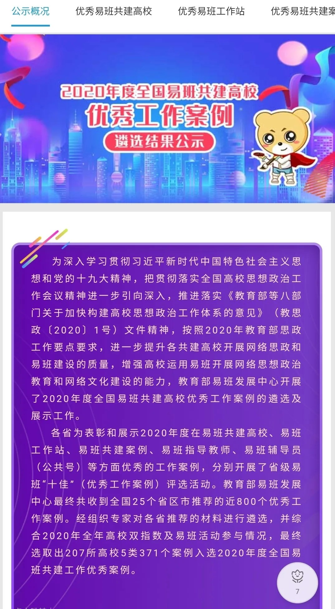 近日,教育部思政司、教育部易班发展中心公布了2020年度全国易班共建高校优秀工作案例遴选结果。本次活动中,教育部易班发展中心共收到各省中心遴选后报送推荐的近800个优秀工作案例。综合2020年全年高校双指数及易班活动参与情况、参选案例支撑材料等维度,经组织专家对各省推荐的材料进行遴选,并综合2020年全年高校双指数及易班活动参与情况,最终选取出207所高校5类371个案例入选2020年度全国易班共建工作优秀案例。