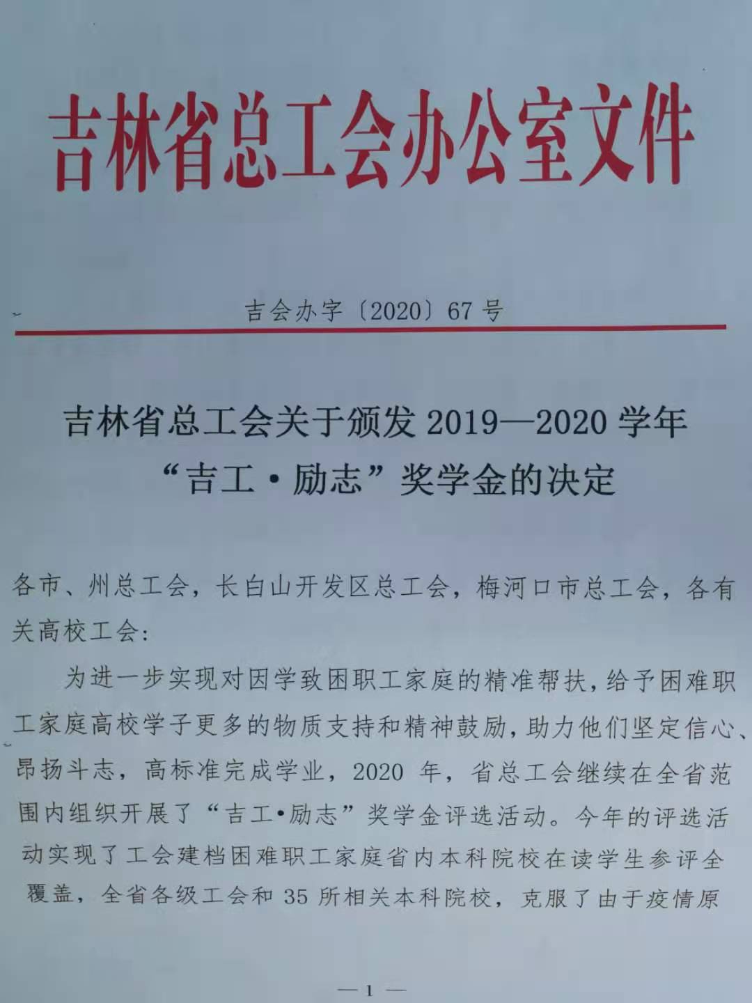 11月4日,吉林省总工会下发《吉林省总工会关于颁发2019—2020学年“吉工•励志”奖学金的决定》(吉会办字〔2020〕67号)文件,公布全省高校2019—2020学年“吉工•励志”奖学金获得者名单,Beat365官网钟浩钊、谭宏扬、张家兴、林宇灏、李昕桐、张晓宇、潘翊、孙梦、田梦媛、王勋10名同学获此殊荣,每人获得奖学金3000元。