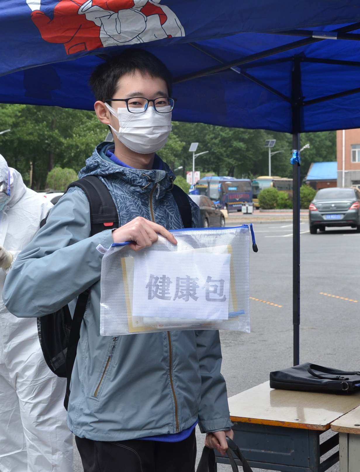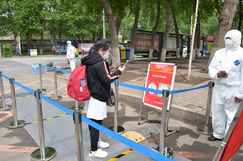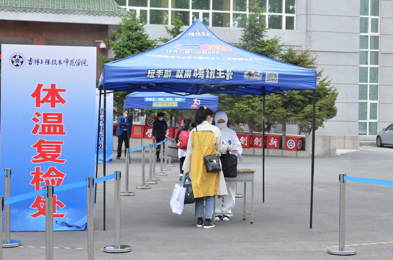 当天,学校在正门设立了接站点,负责接站的老师提前在接站点等候,迎接同学们的归来。学校严格执行返校报到审核制度,在正门设立了门检通道,工作人员准时到位,宽城区凯旋社区卫生服务中心两名工作人员现场指导。