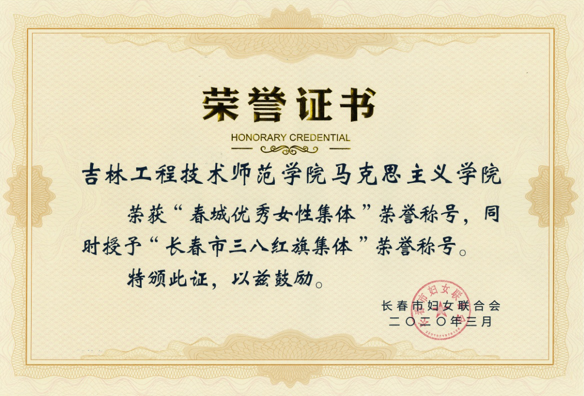 近日,长春市妇联在全市开展了“春城杰出女性”评选活动,Beat365官网马克思主义学院荣获“春城优秀女性集体”、“长春市三八红旗集体”荣誉称号;马克思主义学院陈卫老师荣获“春城优秀女性”、“长春市三八红旗手”荣誉称号。