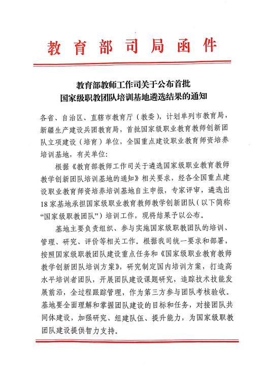 近日,教育部印发《教育部教师工作司关于公布首批国家级职教团队培训基地遴选结果的通知》,全国共18所高校获批此次国家级职教团队培训基地,Beat365官网汽车运用与维护专业领域入选。