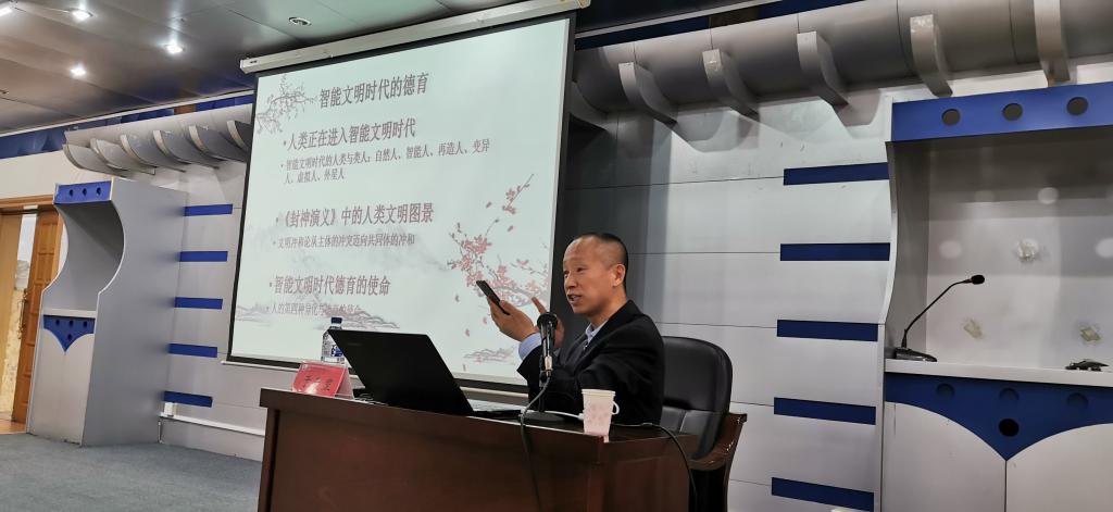 全国优秀社会科学普及名家、领导干部学国学活动专家顾问团成员、正和岛蓝岛(专家)会员、吉林大学政策研究室原主任,陕西楼观道文化研究院特邀研究员、吉林省全民阅读协会副会长,吉林省儒学研究会副会长于天罡教授做了题为“中华传统文化与立德树人”的主题报告。报告从文化与基因、文化与文明、文化与德育三个方面阐释了传统文化的功能,介绍了中华优秀传统文化的核心理念,并就道、德和人的三重属性与立德树人的关系进行了论述,报告最后详细介绍了智能文明时代的德育。