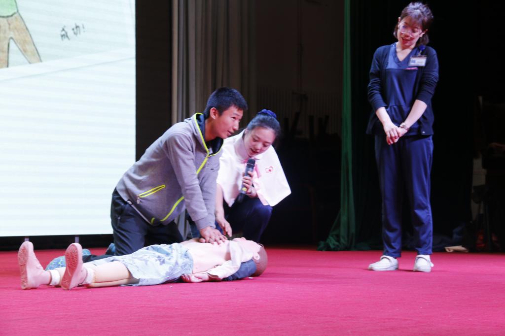 教学组护士石明鑫对美国心脏协会最新颁布的急救“两部曲”进行理论讲解并进行了现场教学:在遇到心脏呼吸骤停患者时,第一步应在拍打患者两肩的同时在其耳边呼唤伤者姓名,并立即指定在场人员拨打急救电话,描述患者情况并告知准确地址;第二步应当把患者移到安全平坦的地方,进行徒手心脏复苏。石明鑫护士表示第一目击者对于患者的抢救尤为重要,使用正确的手势和按压方法也是不容忽视的。在石明鑫护士的演示下,在场的同学们纷纷上台进行了学习体验。