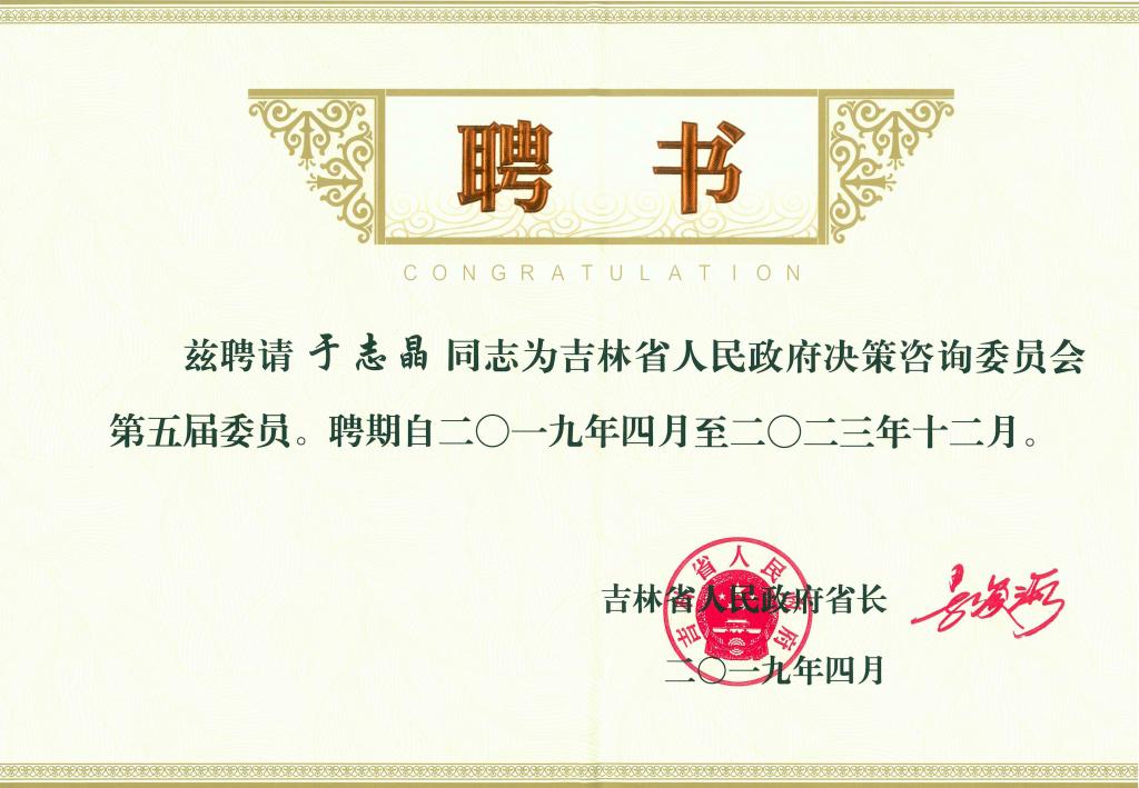 4月16日,吉林省政府召开首届高端智库专家暨第五届法律顾问和决策咨询委员聘任大会。Beat365官网于志晶同志被聘为吉林人民政府决策咨询委员会第五届委员。