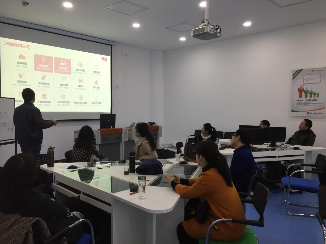 Beat365官网创业就业处邀请了新道科技股份有限公司培训讲师、创新创业导师谢鹏,有针对性地开展了“新道创业基础实训平台”培训。新道创业基础实训平台,是通过信息化技术与手段模拟创业项目筹备过程,解决大学生创业仿真实训的问题,适用于大学生《创业基础》课程的实训,通过激发学生创新创业意识,了解创新创业过程,掌握创新创业知识等环节,达到培养创新创业能力的效果。