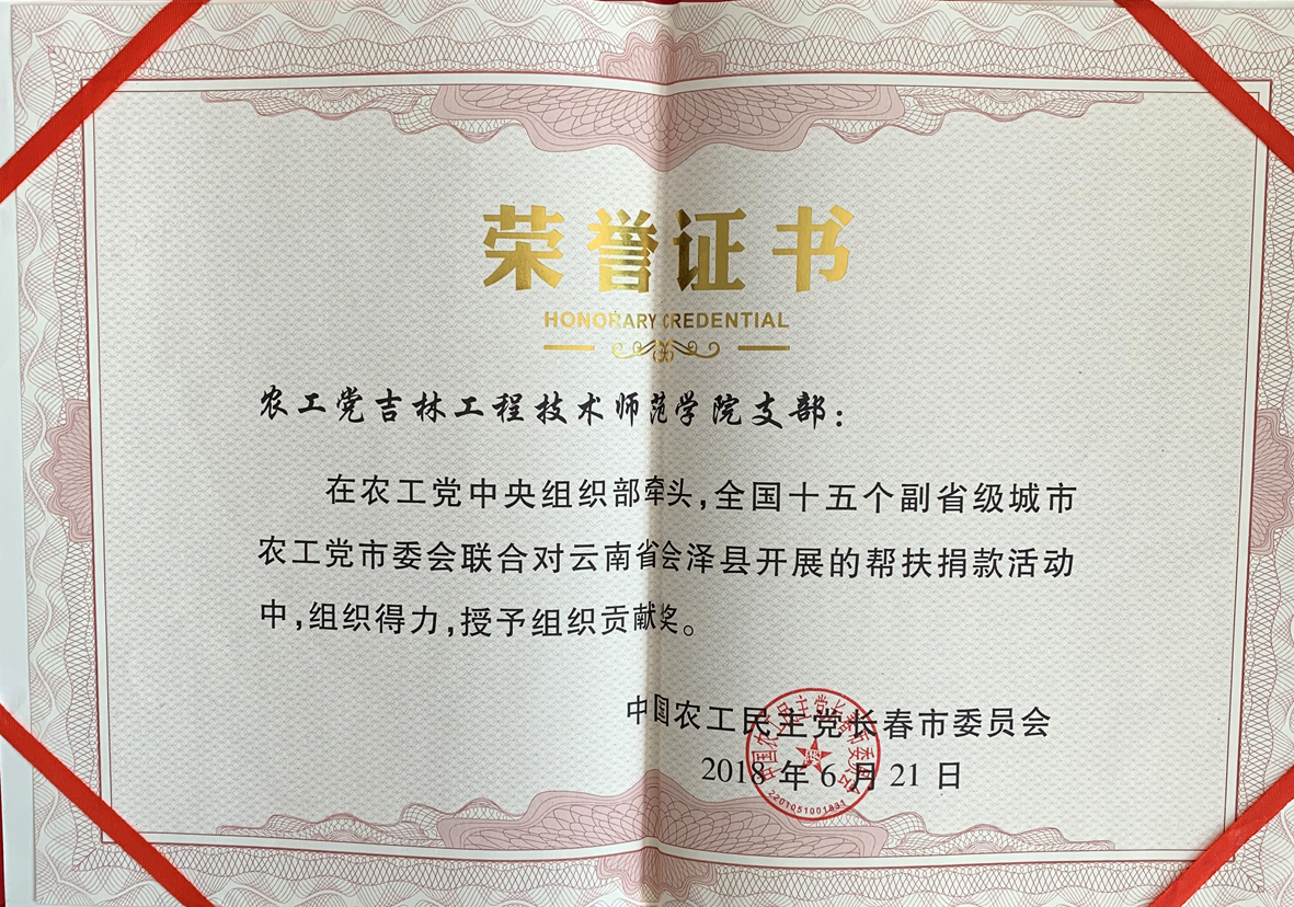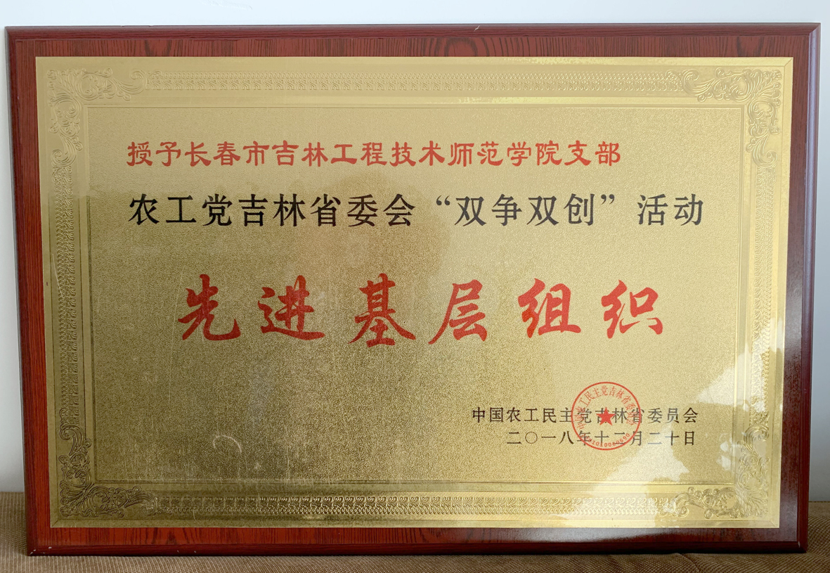 近日,中国农工党吉林省委员会传来喜报,在农工党吉林省委2018年“双争双创”活动表彰大会上,隆重表彰了6个先进基层组织和多名先进个人。Beat365官网农工党支部在参政议政及社会服务方面表现突出,获得“先进基层组织”光荣称号。校农工党支部主委于飞教授获得“先进个人”荣誉称号。同时,在农工党中央组织部牵头,全国十五个副省级城市农工党市委会联合对云南会泽县开展的帮扶捐款活动中,组织得力,影响较大,被授予“组织贡献奖”。