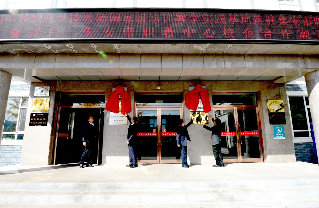 仪式后,集安市教育局李局长、张鹏副校长为全国职业院校教师国家级培训教学实践基地进行揭牌。