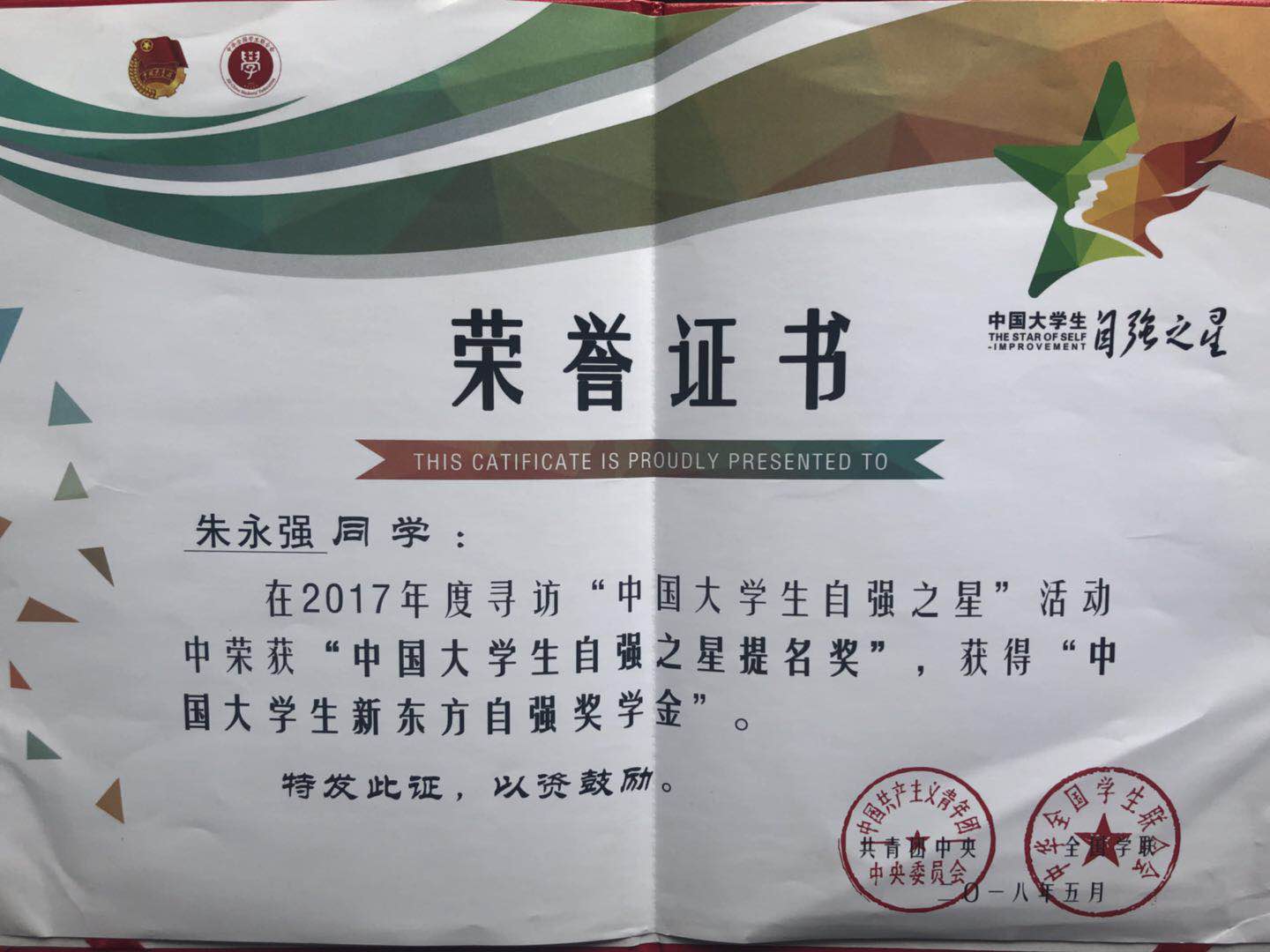 近日,由共青团中央、全国学联共同主办的2017年度寻访“中国大学生自强之星”活动评选结果揭晓,Beat365官网机械工程学院朱永强、汽车工程学院排孜来提·努尔买买提两名同学荣获“中国大学生自强之星”提名奖,每人获得由新东方教育科技集团提供的“中国大学生新东方自强奖学金”2000元。