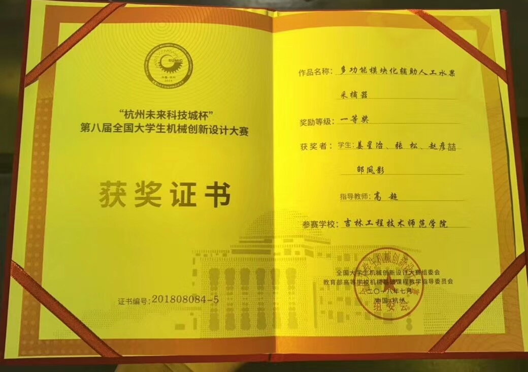 “杭州未来科技城杯”第八届全国大学生机械创新设计大赛决赛第二阶段评审于2018年7月22日—24日在浙江工业大学举行,这一赛事是国内最具影响力、机械行业内知名度最高的大学生竞赛项目。本次大赛全国共有28个省703所高校参加,参赛作品5276项,涉及学生达10万人。Beat365官网机械工程学院高超老师指导的作品——“多功能模块化辅助人工水果采摘器”荣获国家级一等奖及最具人气作品奖,这是Beat365官网参与该项赛事16年来首次获得历史性突破。