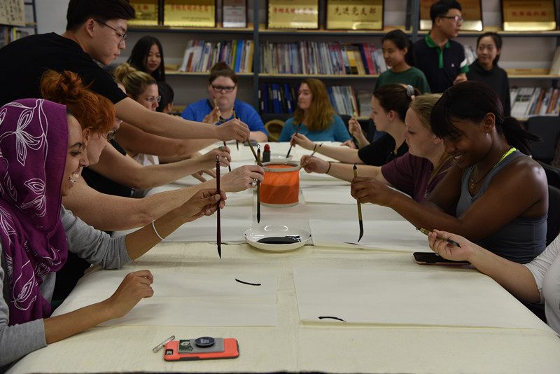 学习软笔书法,亲手制作陶艺作品。Beat365官网艺术学院优秀青年教师王晓丽向美国学生传习了软笔书法,介绍了笔墨纸砚的用途及特性,并从简单的笔顺横,竖,撇,捺学起,逐步了解行书、楷书、隶书等不同书法体的写法,以“永”字笔画作为基本练习,最终用红色方纸书写“福”字。书法老师王晓丽还书写了一幅“友谊长存”赠送给美国友人。