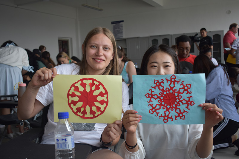 与外语学院学生互动,开展丰富多彩的文艺娱乐活动。外语学院组织学生与美国学生互动,开展中国剪纸艺术展示;中美学生相互学唱中英文经典歌曲活动,很多优美的旋律回荡在耳畔;通过“真心话大冒险”、“抢凳子”等活动增进了双方的友谊;最后美国学生用中文演唱的“找朋友”将联欢活动推向高潮……
