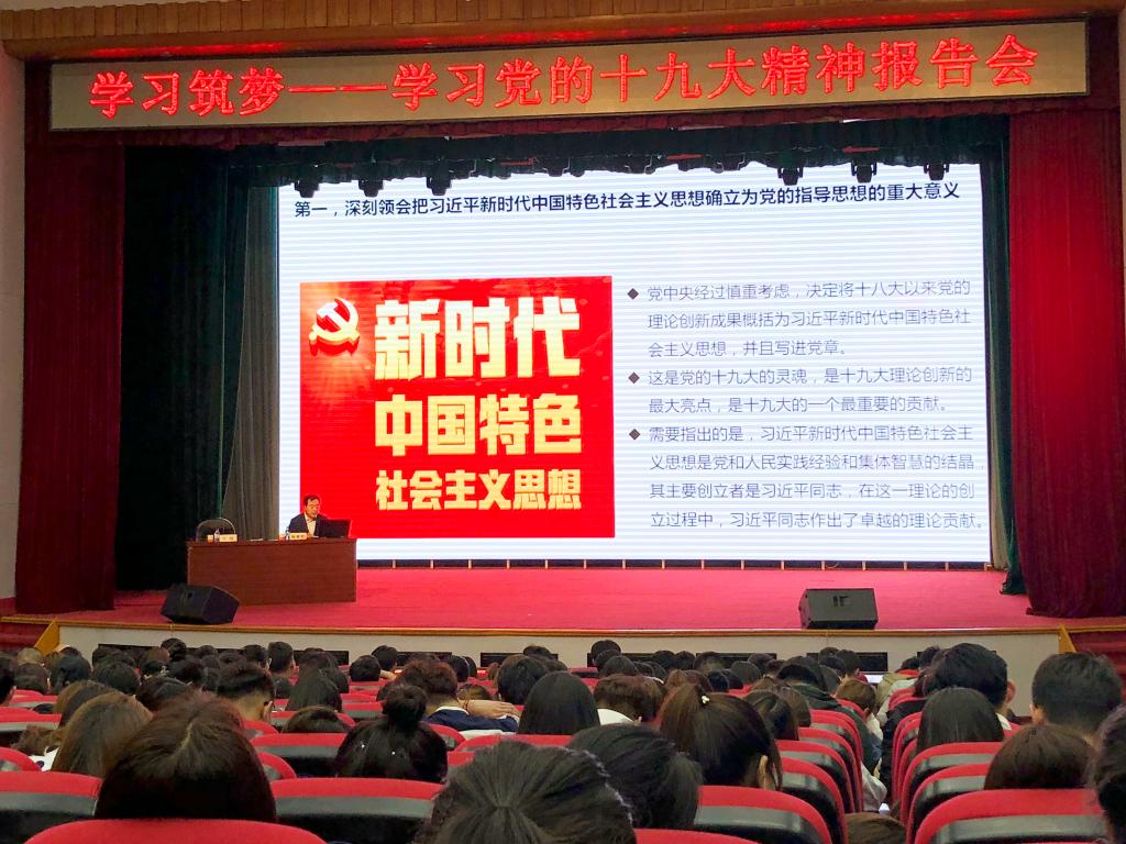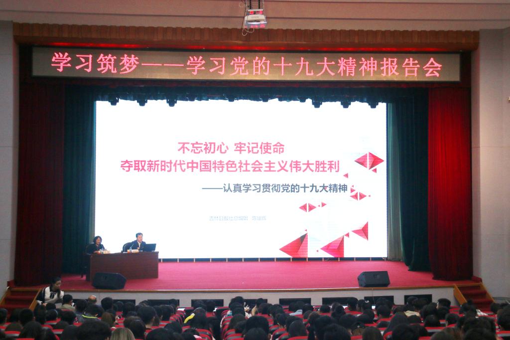 陈耀辉以《不忘初心牢记使命夺取新时代中国特色社会主义伟大胜利——认真学习贯彻党的十九大精神》为题,紧紧围绕党的十九大主题和主要成果、习近平新时代中国特色社会主义思想、过去五年的历史性成就和历史性变革、中国特色社会主义进入新时代、我国社会主要矛盾的变化、两个一百年奋斗目标的战略部署、我国经济社会发展重大战略部署、坚定不移推进全面从严治党等八个方面,对党的十九大精神进行了深入浅出的解读,深刻阐释了党的十九大提出的一系列重要思想、重要观点、重大论断、重大举措。报告论述深刻、逻辑严谨、内容丰富、重点突出,既有理论高度,又有实践深度,为广大师生深入理解、精准把握党的十九大精神,提供了很好的辅导。