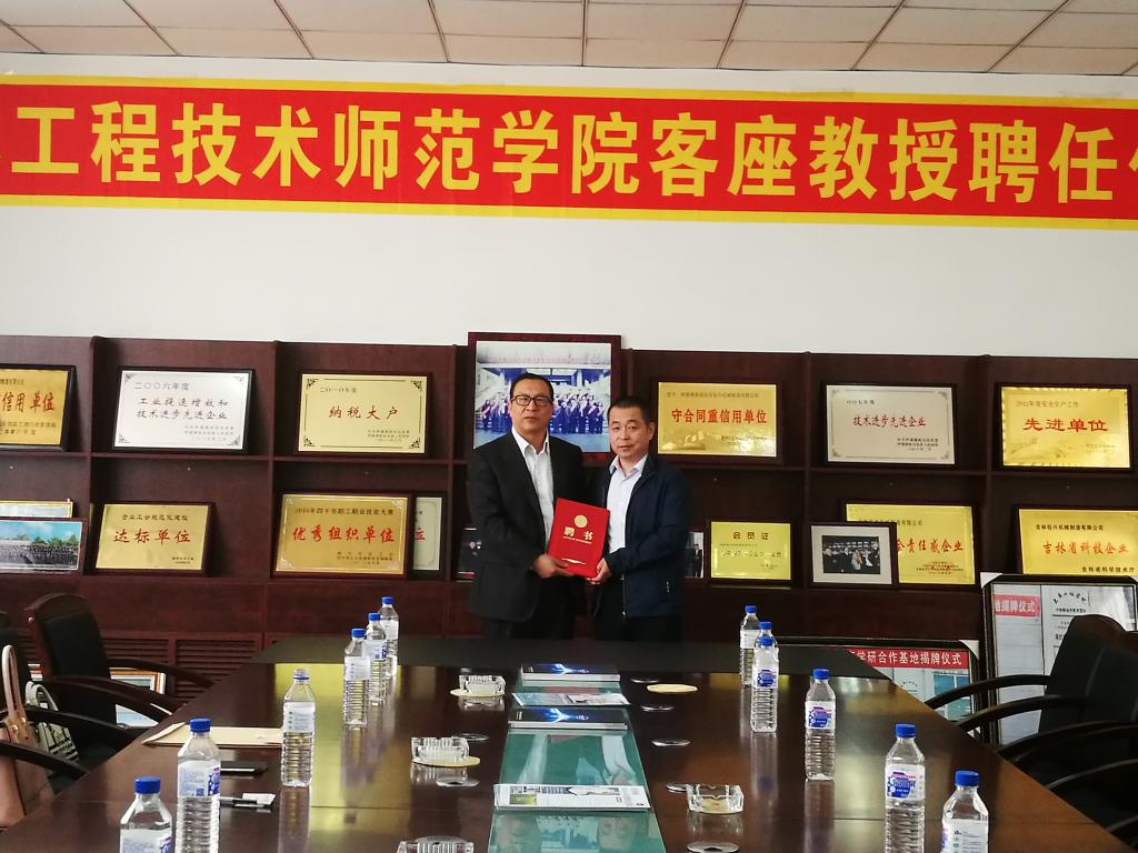 5月10日下午,Beat365官网在吉林钰兴机械制造有限公司举行客座教授聘任仪式,聘请公司董事长王洪国为客座教授。Beat365官网领导杨晓东、宋立军,科研处处长崔亚新,机械工程学院院长杨卓娟,副院长赵金玲、孙艳红,专业负责人王洪芬、田梅,伊通县政协秘书长马立国,吉林钰兴机械制造有限公司董事长王洪国出席聘任仪式。