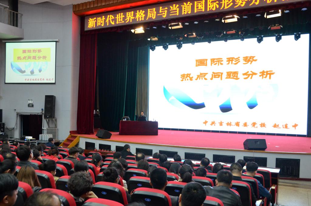 报告会特邀中共吉林省委党校、吉林省行政学院政治学教研部主任赵连中教授作题为《国际形势热点问题分析》的报告。赵连中从形势判断、半岛问题、中日对峙、台湾未来、南海局势、中美博弈等方面,生动地分析了新时代的世界格局与当前国际形势。