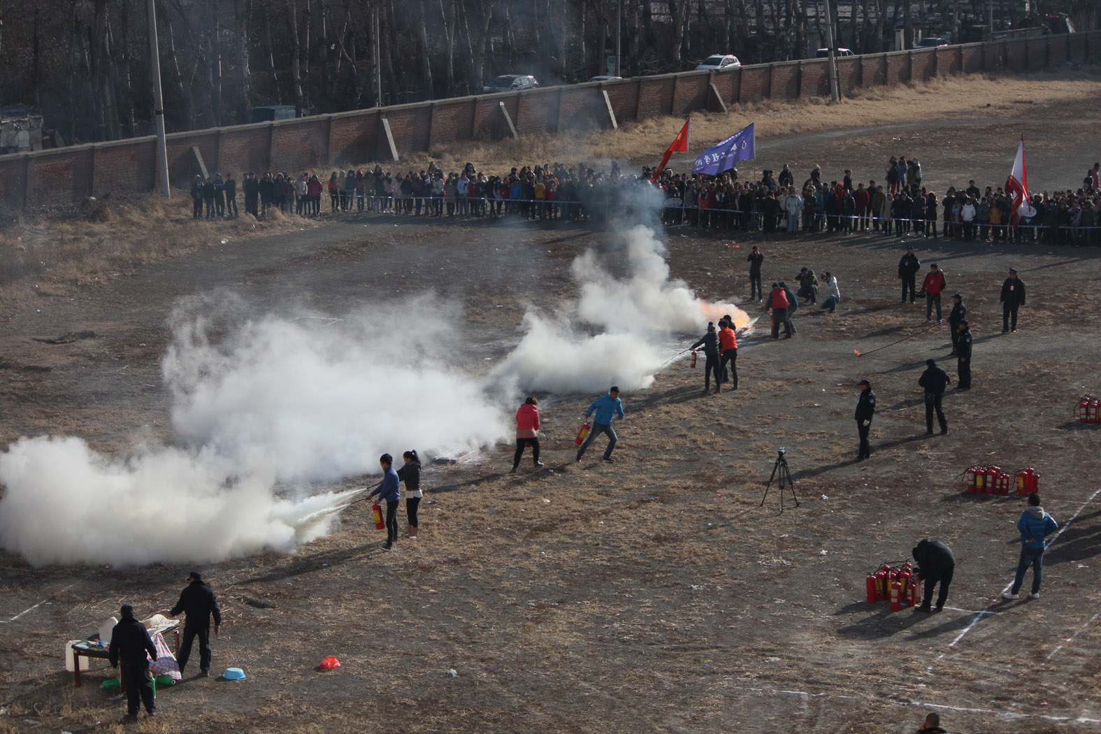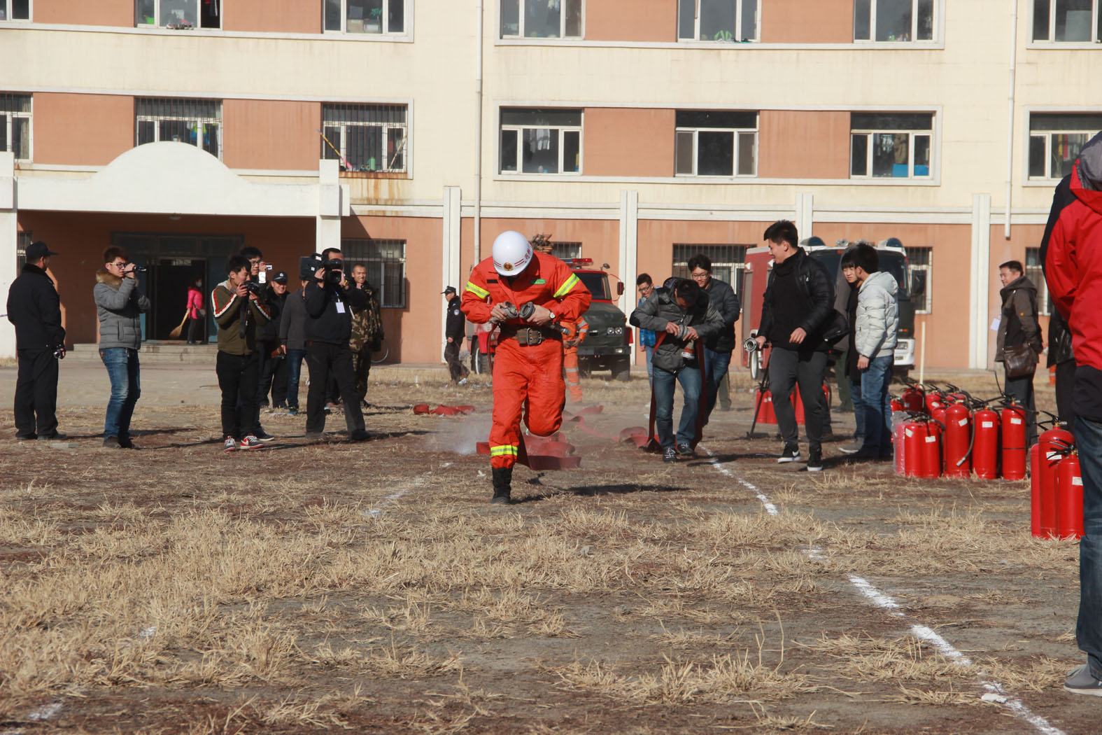 此次实战演练场景模拟真实、活动组织严密,参加演练师生达2600余人,宽城区公安消防大队出动消防车辆3辆,消防官兵20余人,120救护中心出动救护车1辆。学校领导王建华、张云志、刘君义、张鹏参加了演练活动,部分师生员工观摩了演练。中午12时10分演练正式开始,演练的内容及科目包括:楼内疏散、逃生演练、楼内解困、救援演练、楼体模拟灭火演示、水带连接比赛、违规使用禁用电器后果演示、初起火灾扑灭演练等,至12时50分演练活动圆满结束,取得了预期效果。