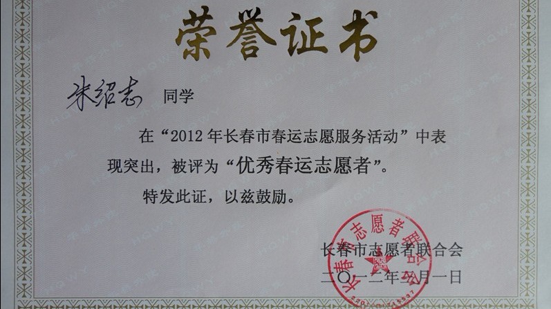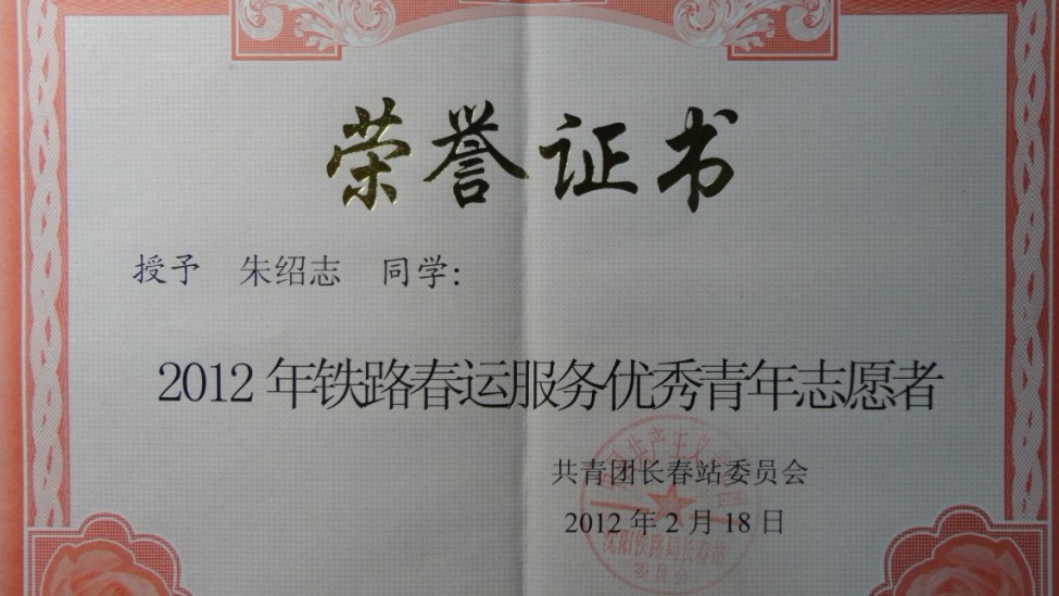 大小不一的行李箱、忙忙碌碌的工作人员、满心期待的归人……今年的长春站又多了这样一道靓丽的风景,年轻的背影、温暖的笑容、优质的服务,这就是春运服务志愿者。朱绍志同学就是其中的一个,他秉承着“奉献、有爱、互助、进步”的志愿者精神,严格要求自己,按时到岗工作,认真的学习各项服务工作,协助车站出色的完成了服务重点旅客、解答旅客问询、宣传网上购票和电话订票知识、协助“三品”检查等工作任务。他以优秀的个人素质、真诚的微笑和热情主动的服务为寒冬中远行的旅客们送去了温暖,送去了关爱,不仅赢得了广大旅客的盛赞,更赢得了广大站内干部职工的一致欢迎和好评。凭其优异的表现,被沈阳铁路局团委和长春站团委分别授予了“2012铁路春运优秀青年志愿者”荣誉称号。