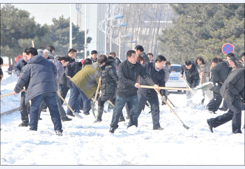 参加清雪的部门:党办、院办、组织部、宣传部、学工部、离退处、纪检监察办公室、审计处、人事处、教务处、科研处、计划财务处、国有资产处、发展规划处、国际交流处、保卫处、招生就业处、团委、后勤管理处、后勤服务总公司