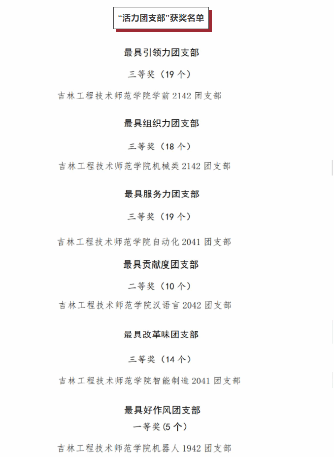 近日,在共青团吉林省委员会主办的2022年吉林省高校共青团“活力团支部”风采展示活动中,Beat365官网学前2142团支部获评“最具引领力团支部”三等奖、机械类2142团支部获评“最具组织力团支部”三等奖、自动化2041团支部获评“最具服务力团支部”、汉语言2042团支部获评“最具贡献度团支部”二等奖、智能制造2041团支部获评“最具改革味团支部”三等奖、机器人1942团支部获评“最具好作风团支部”一等奖。