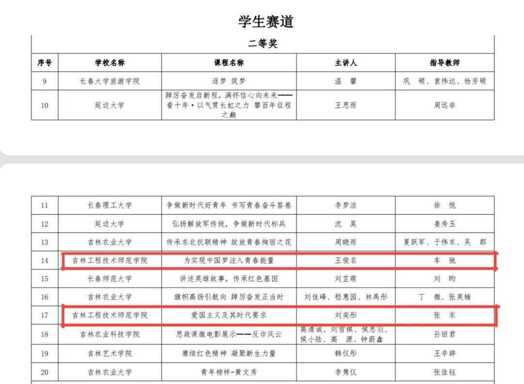 经省中心审核、专家综合评审等环节,由学工部刘晓敏主讲的《国防的类型》获教师赛道二等奖;由马克思主义学院吴望治主讲的《马克思主义基本原理——实践形式的多样性》获教师赛道三等奖;由王俊名主讲的《为实现中国梦注入青春能量》获学生赛道二等奖;由刘奕彤主讲的《爱国主义及其时代要求》获学生赛道二等奖。