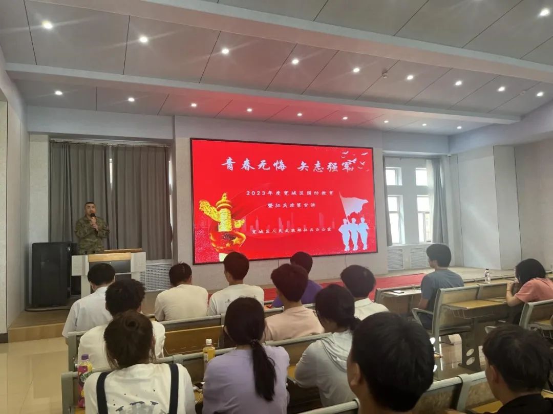 张宸铭围绕近年国防和军队改革发展成就、大学生个人价值实现、宽城区大学生入伍优待政策等方面进行了宣讲,并结合新出台的《兵役法》和新修订的《征兵工作条例》着重对征兵网上报名、体格检查、政治考核等流程和优抚优待政策进行了解读,对征兵体格检查和政治考核流程、标准做了解读,和应征青年进行了互动,对大家普遍关注的问题进行解答。