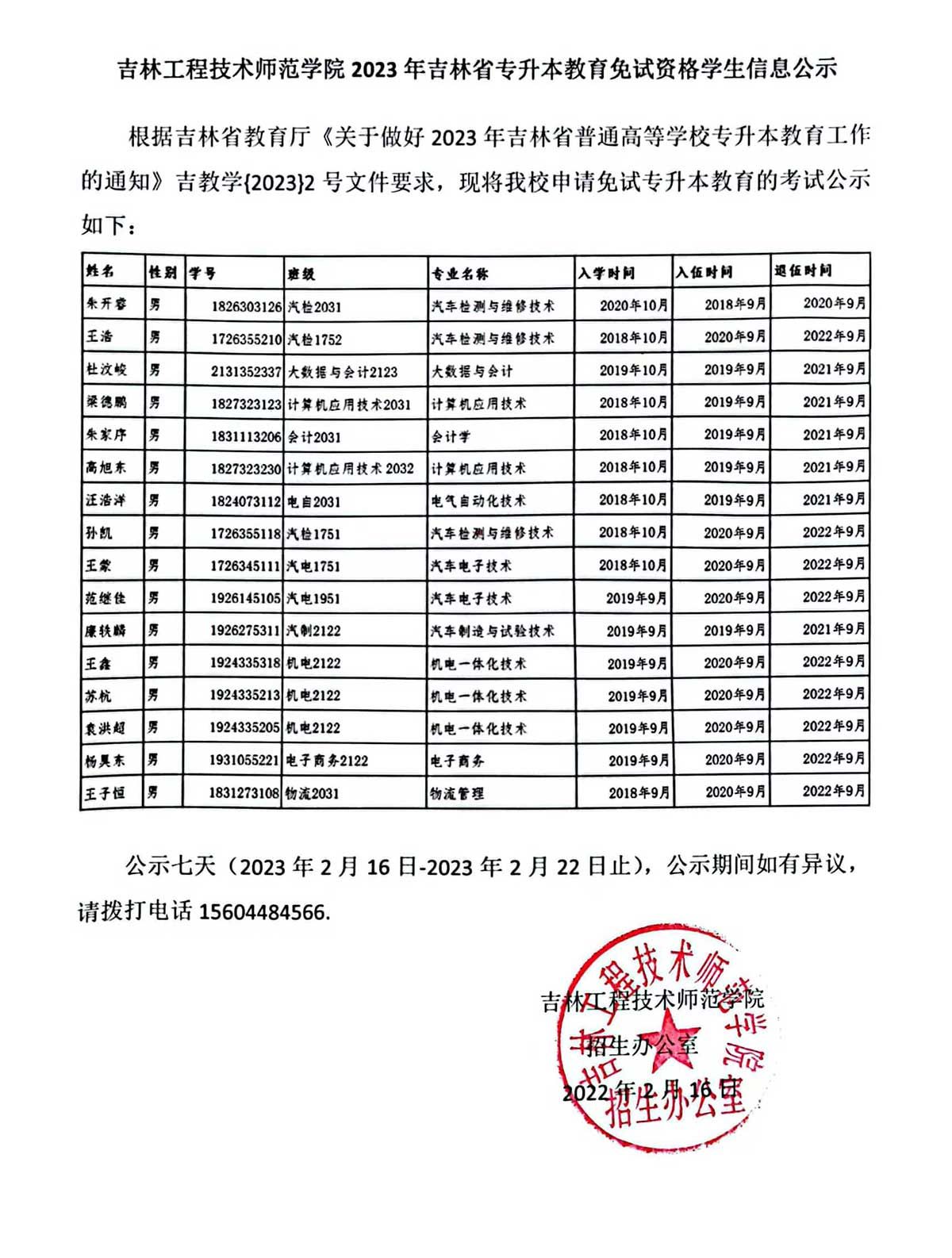 Beat365中文官方网站2023年吉林省专升本教育免试资格学生信息公示