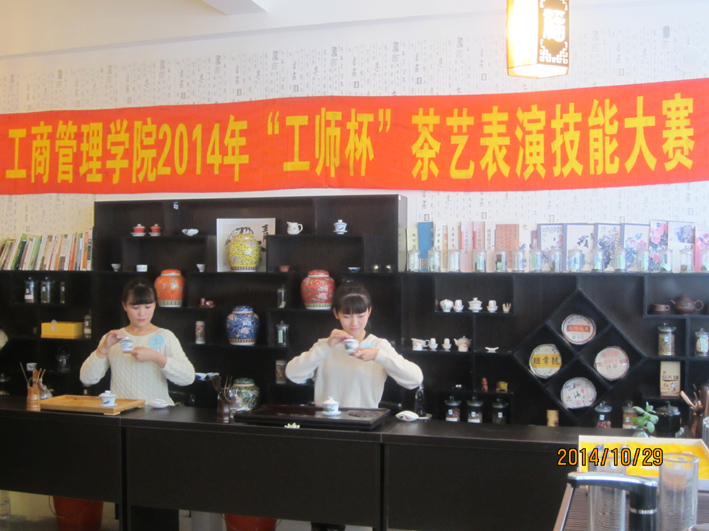 为促进应用型人才培养,全面提升旅游管理专业学生的茶艺操作技能与实践能力,进一步推动教学改革工作,工商管理学院于2014年10月29日下午在新实验楼626茶艺实训室举行了首届“工师杯”大学生茶艺技能竞赛。
