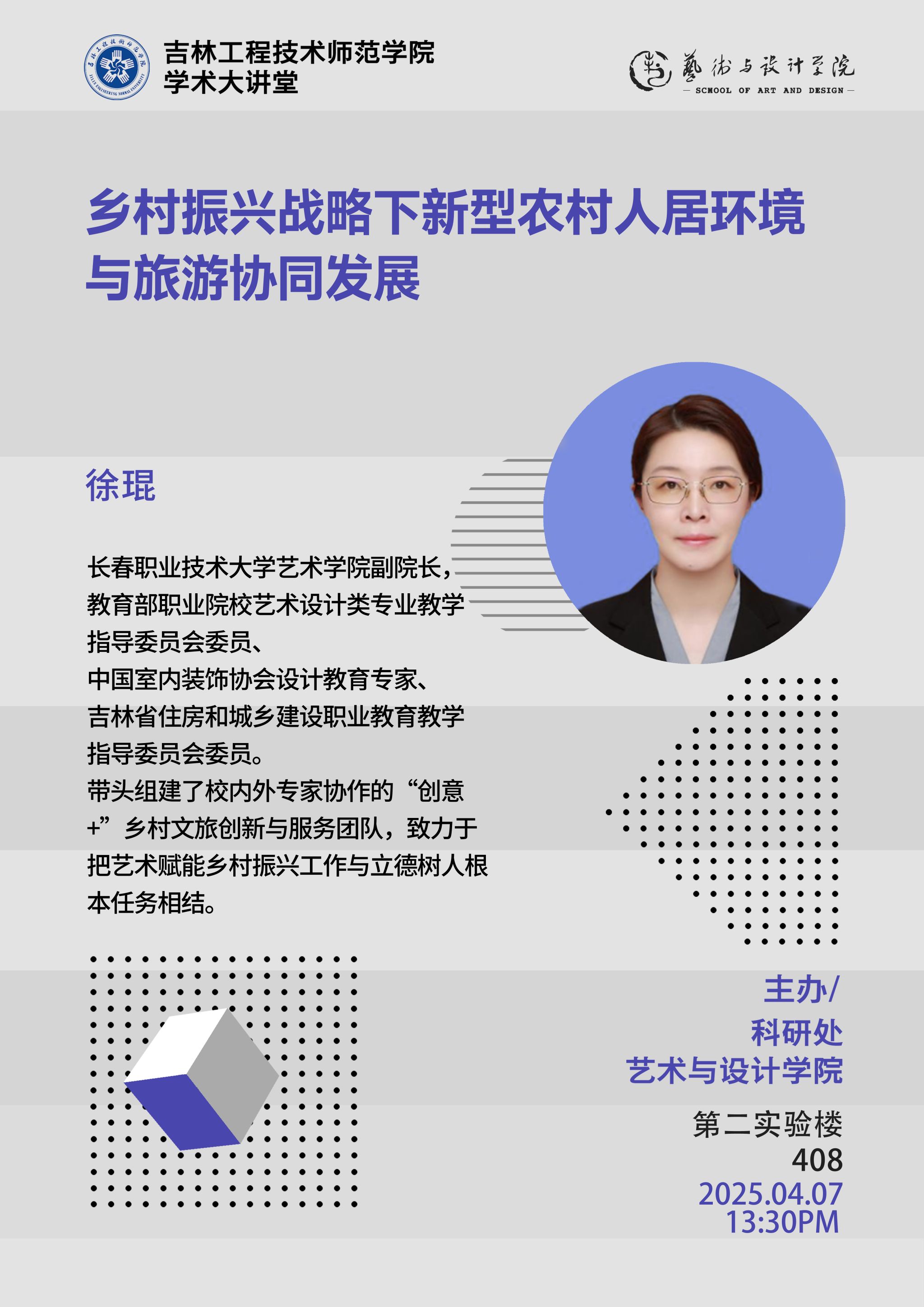 主讲人:徐琨,长春职业技术大学艺术学院 副教授时间、地点:2025年4月7日13:30, 第二实验楼408主办单位:艺术与设计学院、科研处讲座内容:1.农村人居环境发展现状;2.农村人居环境与乡村旅游的关系;3.农村人居环境与乡村旅游协同发展的策略体系;4.旅游与乡村景观规划设计实践。