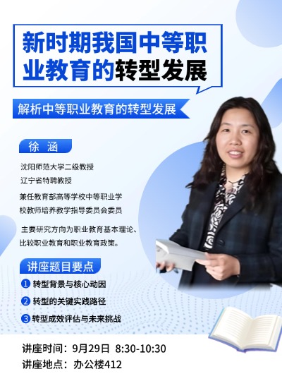 主讲人:徐涵,沈阳师范大学 教授时间、地点:2025年9月29日8:30, 凯旋校区办公楼412主办单位:教育科学学院、科研处讲座内容:1.转型背景与核心动因;2.转型的关键实践路径;3.转型成效评估与未来挑战。
